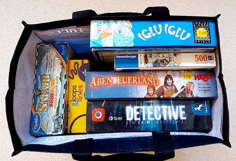 In our small town there is something like a public library for board and card games, jigsaw puzzles and the like. It’s called the Spieliothek (a play on the German words for game and library) and can be used free of charge. They have about 12,500 games and jigsaw puzzles and we love to drop in from time to time to browse and borrow some of them.