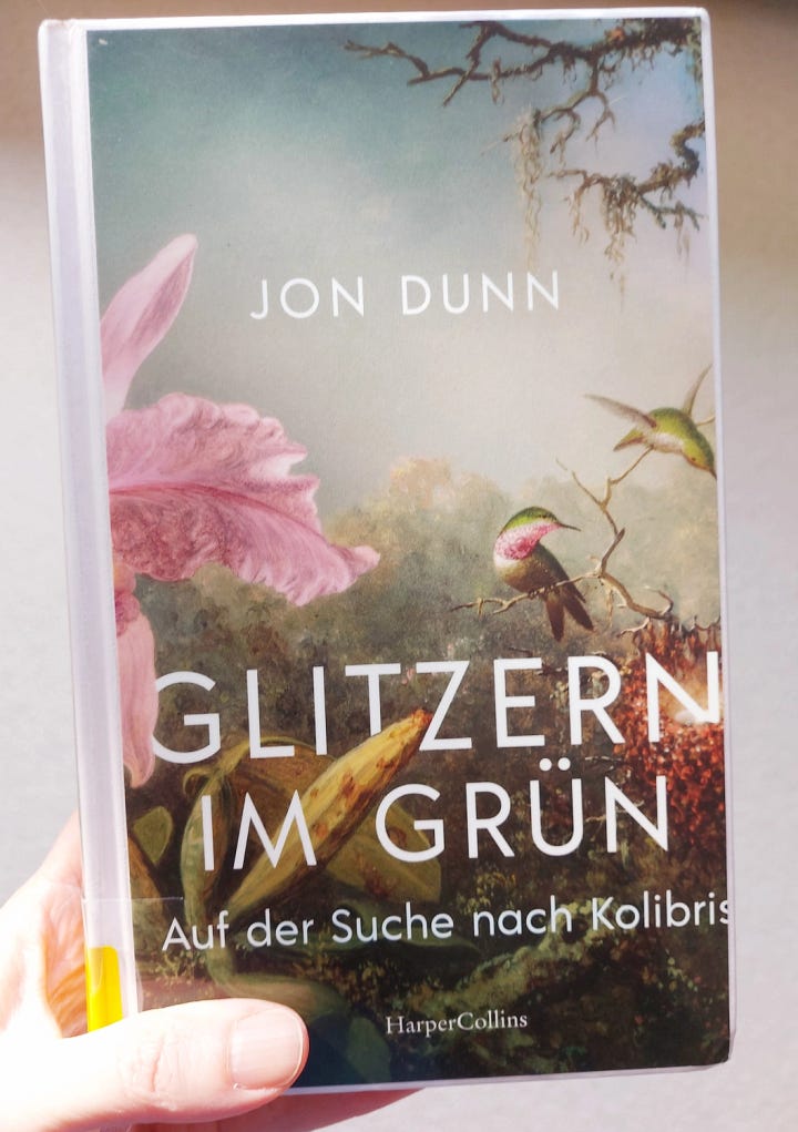He combines the telling of this journey with lots of interesting information about hummingbirds in history, mythology, art, culture, spirituality and more. He doesn’t shy away from the negative side either, the history of their exploitation as in the rich Europeans' obsession with shooting hummingbirds for their collections, fashion trends like decorating hats with feathers or entire birds or using them as good-luck charm. But there are also fun bits like what James Bond had to do with (humming)birds - or straight scientific facts like the explanation for the iridescent colours of their feathers that are unmatched.