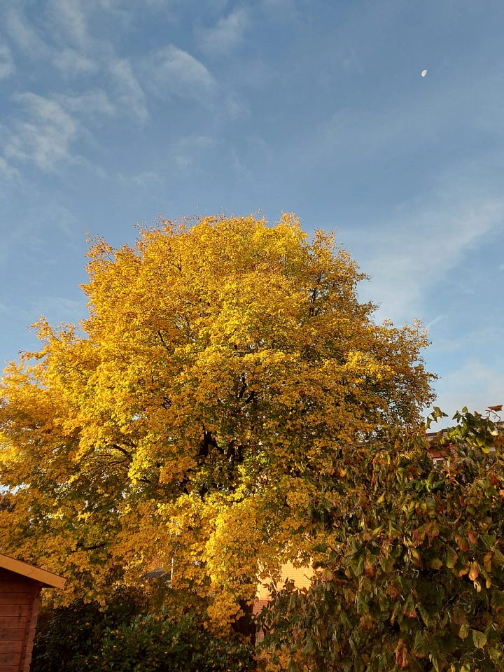 The early rays of sunlight bathe our maple tree at the end of the garden in a golden glow. Are the first leaves turning yellow - or is it just an illusion?
